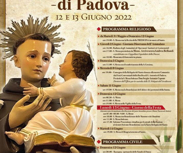 Mercoledì 8 giugno alle ore 19.00, nell’ambito dei festeggiamenti della parrocchia di S. Antonio di Pontecagnano Faiano, si tiene la consegna della reliquia di S. Antonio donata dai frati conventuali della Basilica di S. Antonio di Padova. Presiede la messa don ...
