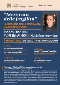 Martedì 3 maggio alle ore 19.00 sulla piattaforma Cisco Webex si tiene un incontro con padre Tiziano Tosolini, Missionario saveriano, dal tema: Avere cura delle fragilità. La Missione della sinodalità della chiesa oggi.