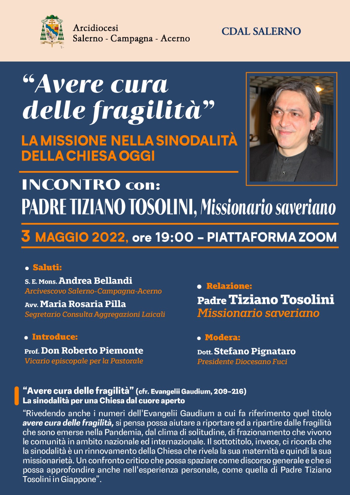 Martedì 3 maggio alle ore 19.00 sulla piattaforma Cisco Webex si tiene un incontro con padre Tiziano Tosolini, Missionario saveriano, dal tema: Avere cura delle fragilità. La Missione della sinodalità della chiesa oggi.