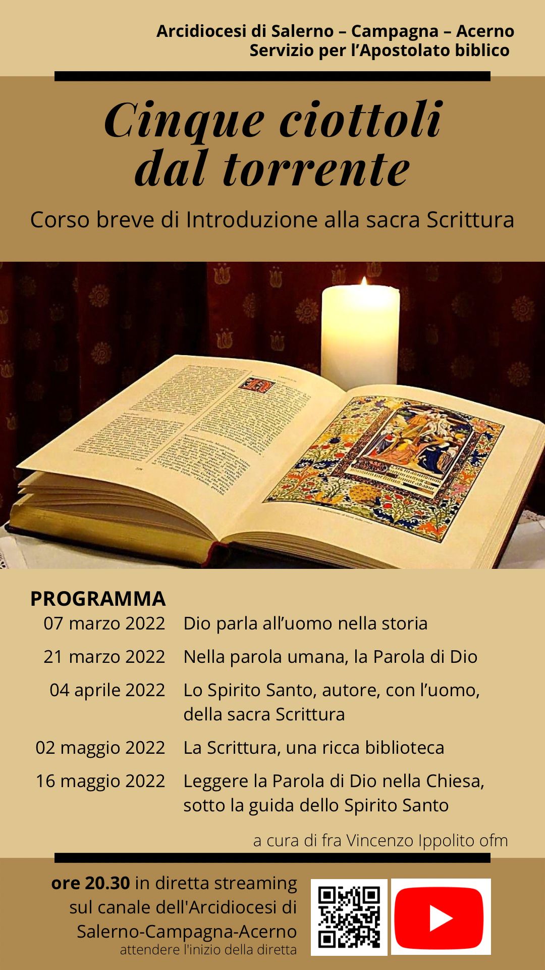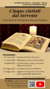 Lunedì 7 marzo alle ore 20.30 in diretta streaming sul canale YouTube dell’Arcidiocesi di Salerno-Campagna-Acerno è partito un breve corso di introduzione alla Sacra Scrittura dal titolo “Cinque ciottoli dal torrente” tenuto da P. Vincenzo Ippolito ofm, Biblista e docente di Sacra Scrittura. Un percorso di 5 incontri per comprendere la Sacra Scrittura rivolto a tutti ma soprattutto ai collaboratori e agli operatori pastorali.