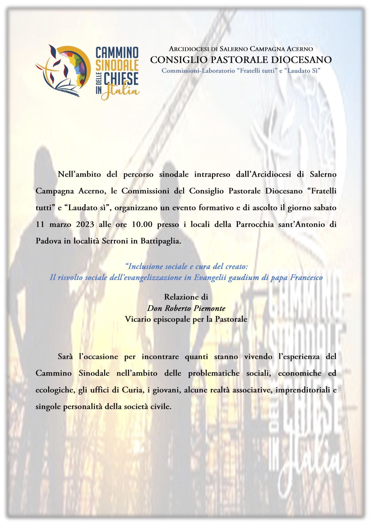 Nell’ambito del percorso sinodale intrapreso dall’Arcidiocesi di Salerno-Campagna-Acerno, le commissioni del Consiglio Pastorale diocesano “Fratelli tutti” e “Laudato si'”, organizzano un evento formativo e di ascolto il giorno sabato 11 marzo alle ore 10.00 presso i locali della parrocchia Sant’Antonio di Padova in località Serroni di Battipaglia dal titolo “Inclusione sociale e cura del creato: il risvolto sociale dell’Evangelii gaudium di Papa Francesco“, relazione don Roberto Piemonte, vicario episcopale per la pastorale. Un incontro rivolto a quanti stanno vivendo l’esperienza del Cammino Sinodale nell’ambito delle problematiche sociali, economiche ed ecologiche, agli uffici di curia, ai giovani e ad alcune realtà associative e imprenditoriali.