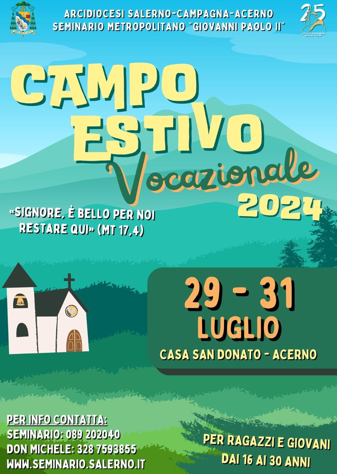 Il Seminario Metropolitano “Giovanni Paolo II”, in seguito alla riapertura della struttura del Seminario di Acerno, riprende, come è da tradizione, il Campo-scuola Vocazionale dal 29 al 31 luglio, rivolto ai giovani e ai ragazzi dal 16 ai 30 anni.
