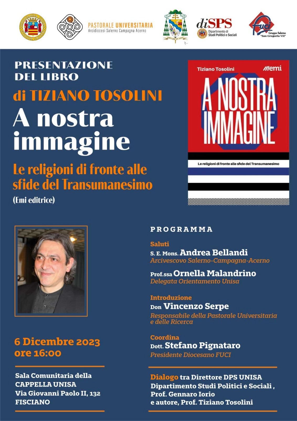 Mercoledì 6 dicembre alle ore 16.00, nella Sala Comunitaria della Cappella Unisa si terrà la presentazione del libro di Tiziano Tolsolini dal titolo “A nostra immagine, le religioni di fronte alle sfide del Transumanesimo”.