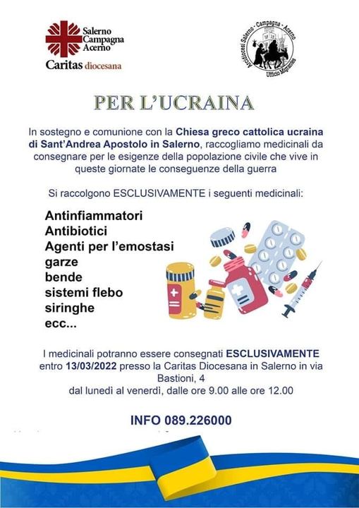 In sostegno e comunione con la Chiesa greco cattolica ucraina di Sant’Andrea Apostolo in Salerno, la Caritas diocesana e l’ufficio diocesano Migrantes hanno organizzato una raccolta di medicinali per le esigenze della popolazione civile che sta vivendo le conseguenze della guerra.