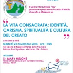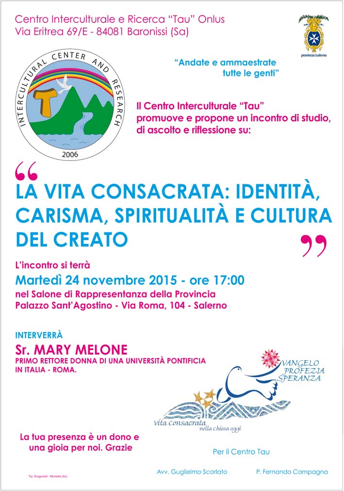 Il Centro Interculturale “Tau” promuove e propone un incontro di studio, di ascolto e riflessione su: “La vita consacrata: identità, carisma, spiritualità e cultura del creato” L’incontro si terrà martedì 24 novembre 2015 – ore 17:00 nel Salone ...