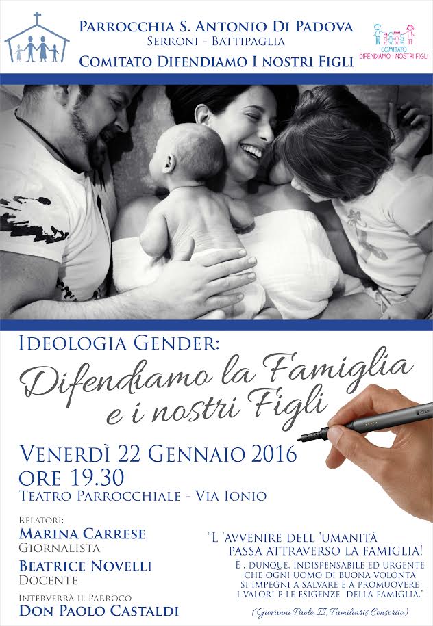 Parrocchia Sant'Antonio di Padova Serroni - Battipaglia Comitato difendiamo i nostri figli Ideologia Gender:parrocchia sant'Antonio battip Difendiamo la famiglia e i nostri figli venerdì 22 gennaio 2016 ore 19,30 Teatro Parrocchiale - Via Ionio