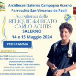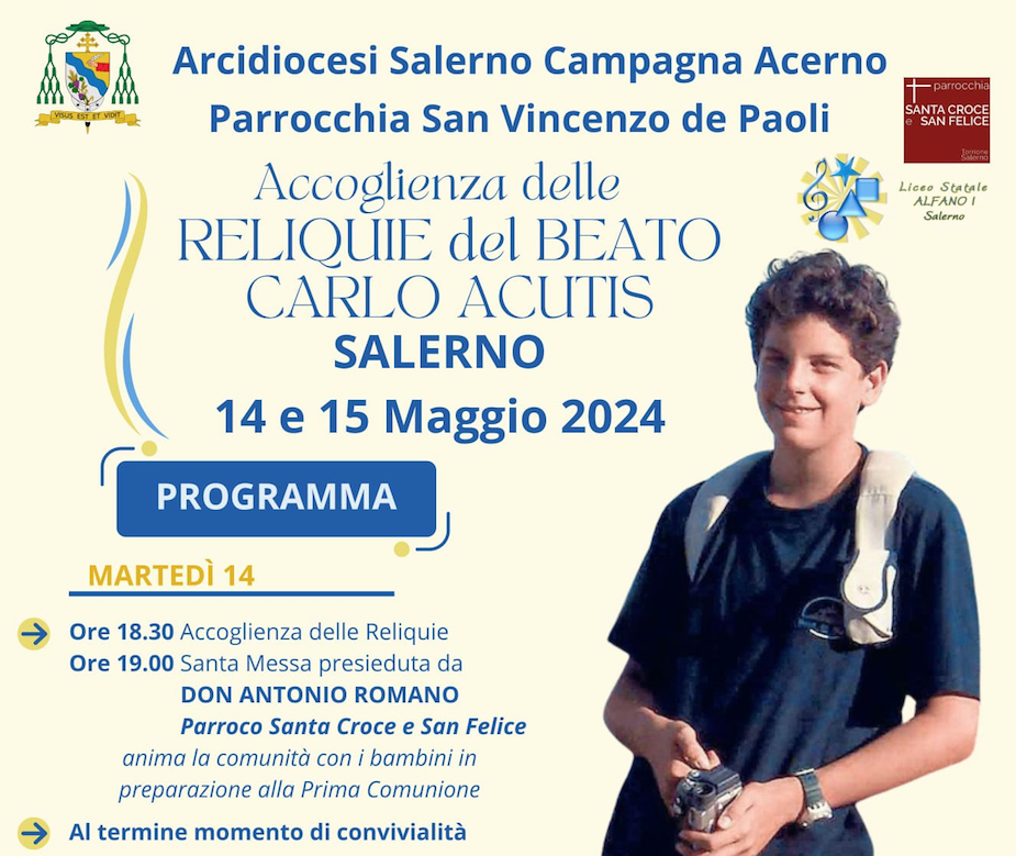 Il 14 e il 15 maggio la parrocchia San Vincenzo de Paoli di Salerno accoglie le Reliquie del Beato Carlo Acutis, ragazzo dei giorni nostri che in un breve tratto della sua vita è diventato testimone di Dio per i ...