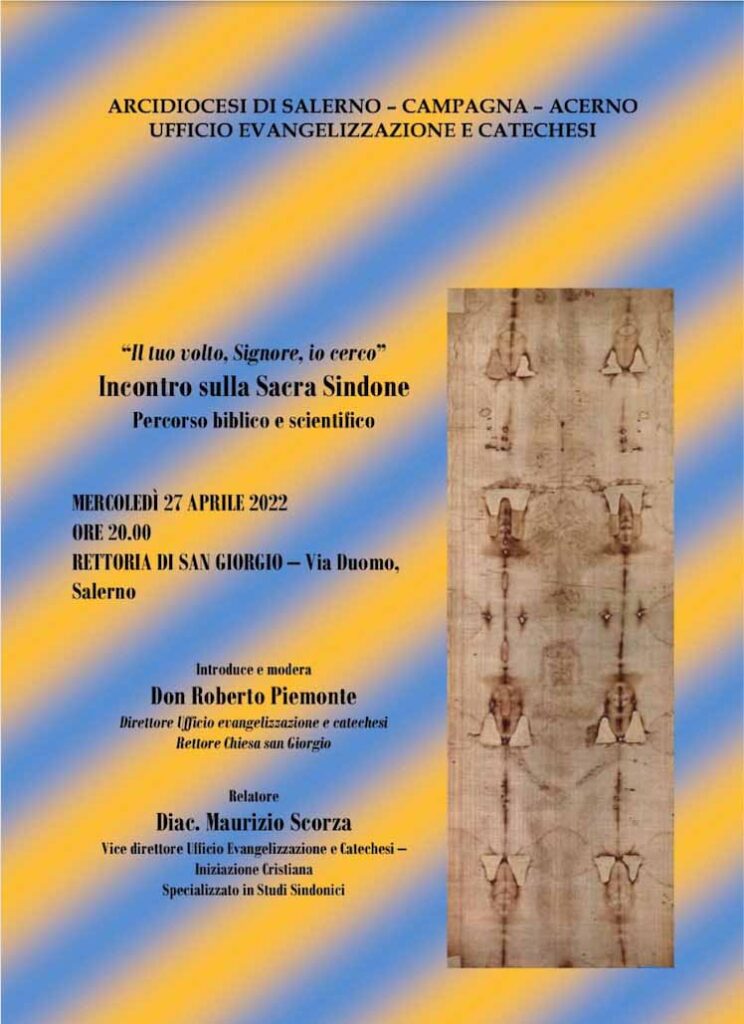 Mercoledì 27 aprile alle ore 20.00 presso la rettoria di San Giorgio si tiene un incontro biblico scientifico sulla Sacra Sindone dal titolo “Il tuo volto, Signore, io cerco”. Introduce e modera don Roberto Piemonte, direttore dell’Ufficio Evangelizzazione e catechesi; ...