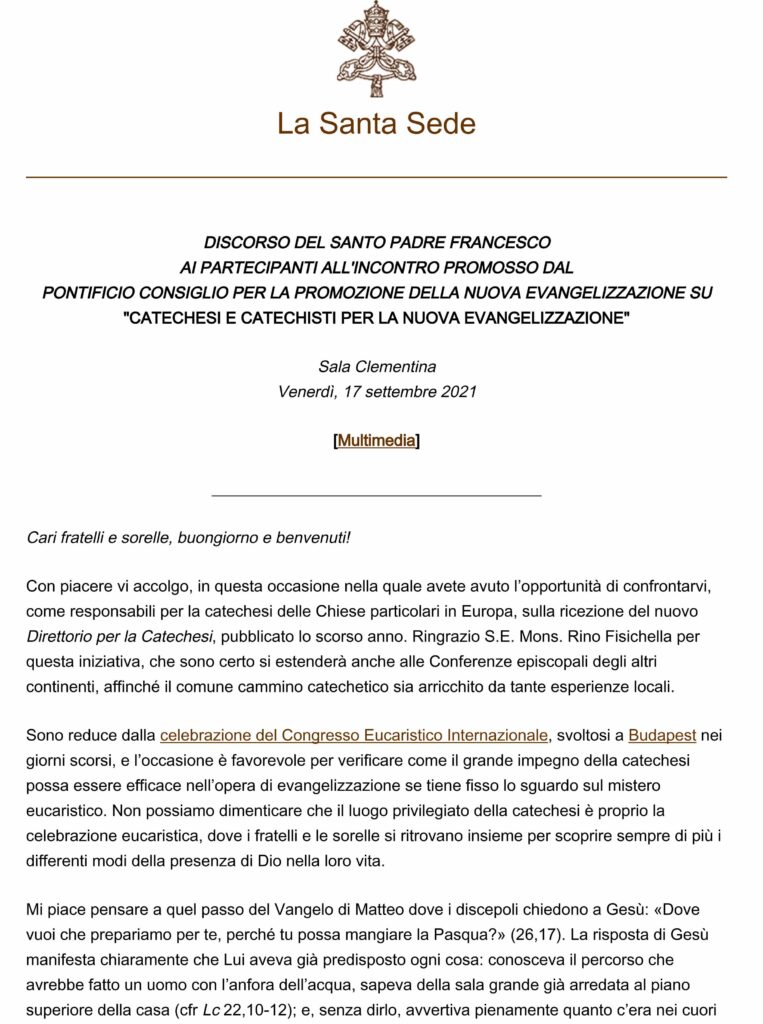 Il Santo Padre interviene ulteriormente sul tema della nuova evangelizzazione arricchendo di spunti la riflessione sulla figura del catechista.