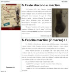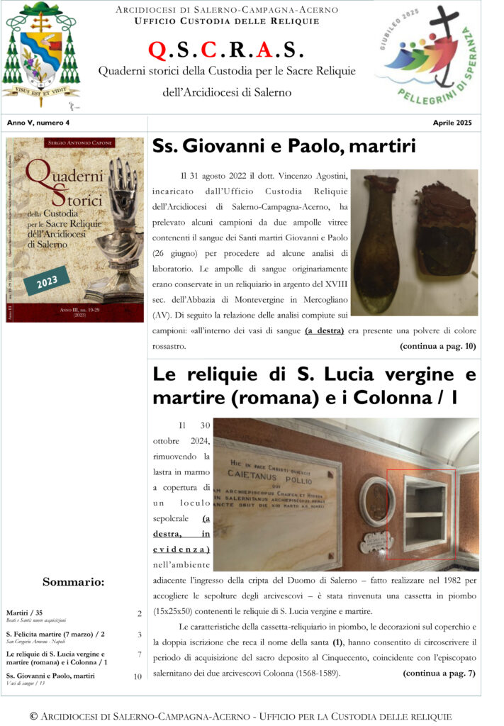 Nell’edizione QSCRAS numero 3 del mese di marzo 2025, in apertura, nella rubrica “Vasi di sangue”, vengono trattate le reliquie di San Festo diacono e martire. Le pagine successive sono dedicate alla ricognizione canonica delle reliquie di Santa Felicita Martire. ...