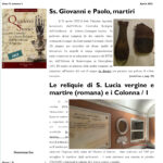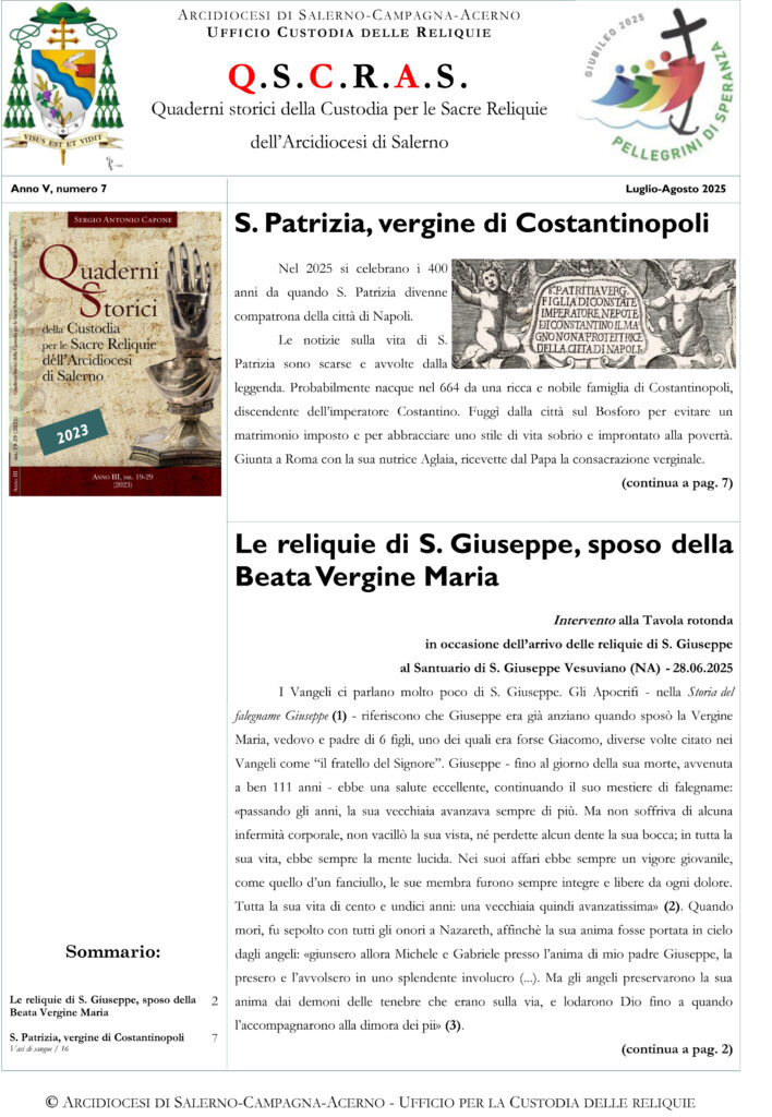 Nell’edizione QSCRAS numero 9 del mese di ottobre, troviamo la seconda parte dell’articolo sulle reliquie di San Matteo Apostolo e Evangelista, la loro traslazione e nuovi approfondimenti e studi. A pagina 5 continua l’articolo introdotto in copertina sui Ss. Quirino/Cirino ...