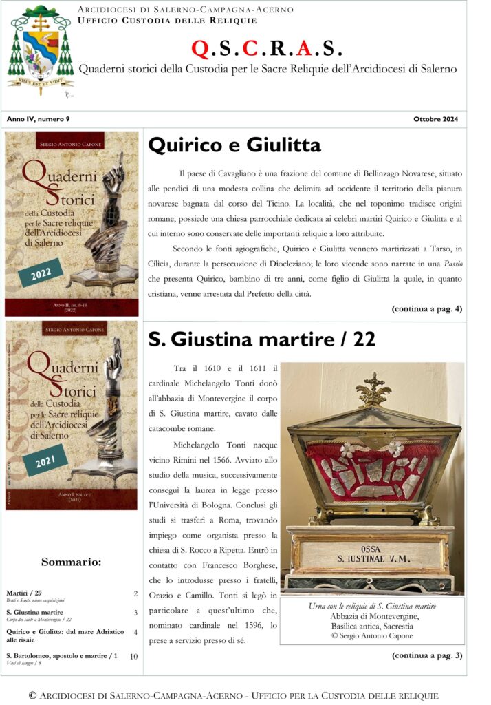 L’edizione QSCRAS numero 9, ottobre 2024, apre con la storia dei santi Quirico e Giulitta e con le reliquie di San Giustina. Nella rubrica “Beati e Santi” elenca le nuove acquisizioni delle reliquie provenienti dal monastero di San Gregorio Armeno ...