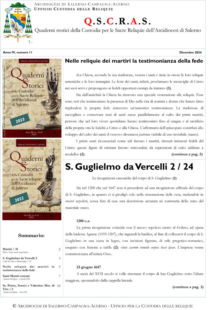 L’edizione QSCRAS numero 11, dicembre 2024, apre con un articolo dal titolo “Nelle reliquie dei martiri la testimonianza della fede” e con la seconda parte della traslazione di S. Guglielmo da Vercelli. Nella rubrica “Beati e Santi” elenca le nuove ...