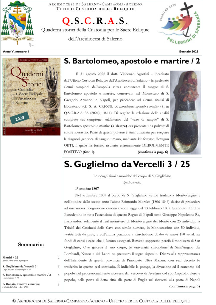 La prima edizione QSCRAS del 2025, apre con la storia delle reliquie di San Bartolomeo, apostolo e martire e e con la seconda parte della ricognizione canonica di San Guglielmo da Vercelli. Nella rubrica “Beati e Santi” elenca le nuove ...