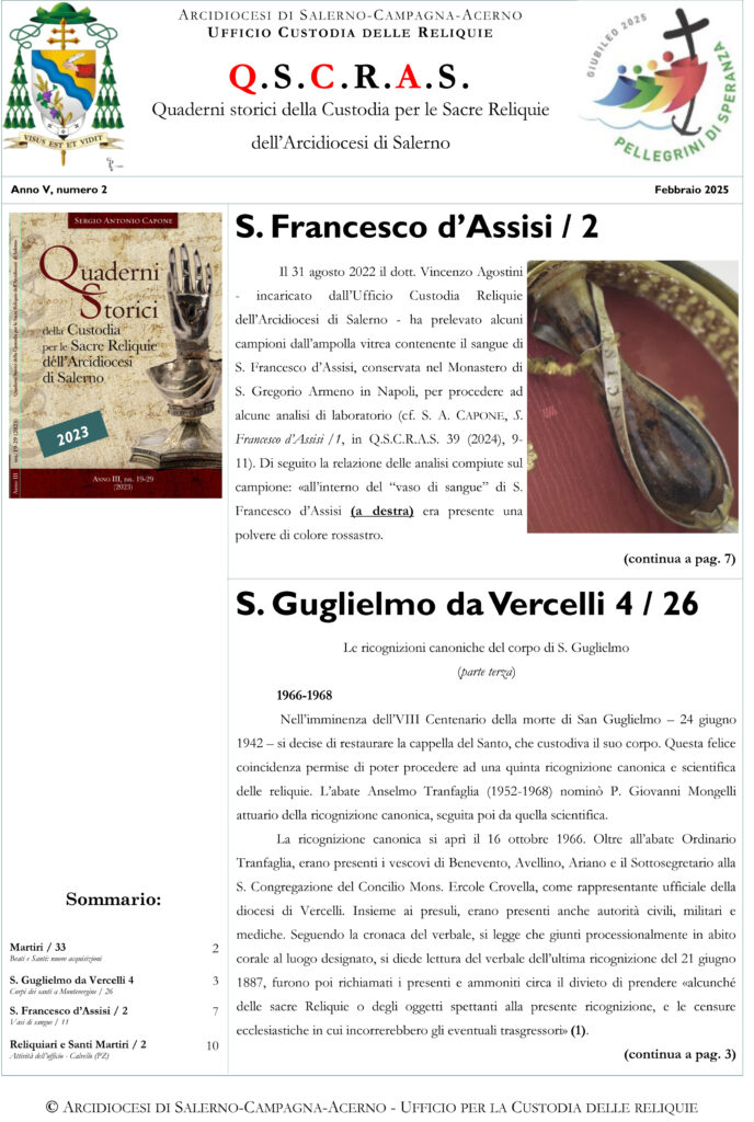 La seconda edizione QSCRAS del 2025, gennaio 2025, apre con la relazione delle analisi compiute sul campione dall’ampolla vitrea contenente il sangue di S. Francesco d’Assisi, e, nella seconda parte, delle ricognizioni canoniche del corpo di S. Guglielmo, articoli che continuano ...