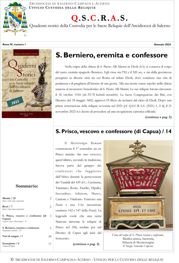 Il primo numero del 2024 QSCRAS, apre la sua prima pagina, con le reliquie di S. Berniero, eremita e confessore, e di S. Prisco, vescovo e confessore, argomenti approfonditi rispettivamente a pagina cinque e tre. In occasione dell’anno nuovo, QSCRAS, a pagina ...