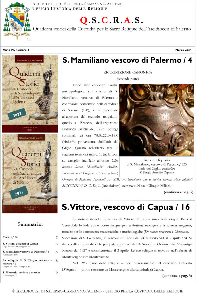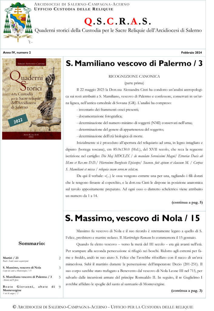 L’edizione QSCRAS numero 2, febbraio 2024, apre con la ricognizione canonica di S. Mamiliano vescovo di Palermo e di S. Massimo, vescovo di Nola. Nella rubrica Beati e Santi elenca le nuove acquisizioni delle reliquie provenienti dal monastero di San ...