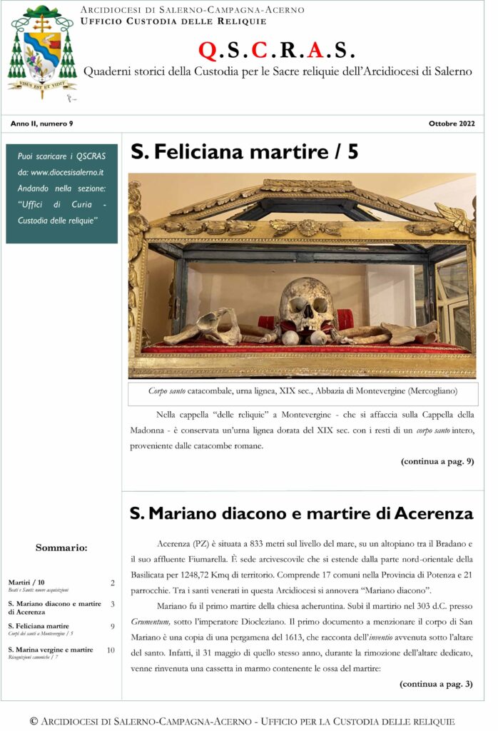 L’edizione QSCRAS numero 10 del mese di novembre 2022, apre la sua prima pagina con le reliquie di S. Modestino vescovo e martire, custodite presso l’Abbazia di Montevergine (Av) e le ricognizioni e di Ss. Archelaide, Tecla e Susanna Mm ...