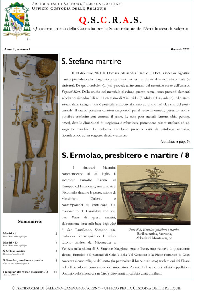 L’edizione QSCRAS numero 1 del mese di gennaio 2023, apre la sua prima pagina, con le reliquie di S. Stefano Martire e di S. Ermolao, presbitero e martire, argomenti approfonditi rispettivamente a pagina tre e quattro. La rubrica “Attività dell’Ufficio” ...
