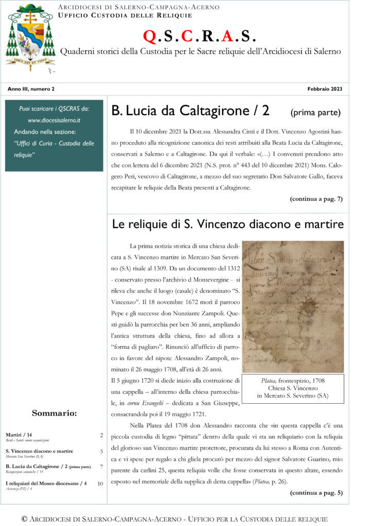 L’edizione QSCRAS numero 2 del mese di febbraio 2023, apre la sua prima pagina, con le reliquie della beata Lucia da Caltagirone e delle reliquie di S. Vincenzo diacono e martire, articoli approfonditi rispettivamente a pagina sette e cinque. La ...