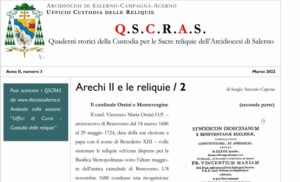 Il numero di marzo 2022, dedica nuovamente la prima pagina alle reliquie di Arechi II. Nella rubrica “La fede attraverso l’arte” analizza i reliquiari dei Santi vescovi e il monastero di Santa Teresa in Solofra, tratta, poi, dei reliquiari a urna di ...