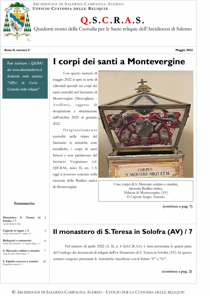 Il numero di maggio 2022, si occupa dei resti dei corpi dei santi a Montevergine, S. Mercurio soldato e martiree del monastero di S. Teresa in Solofra. Tratta ancora delle capsule in legno conservati presso la Collegiata di S. Michele Arcangelo ...