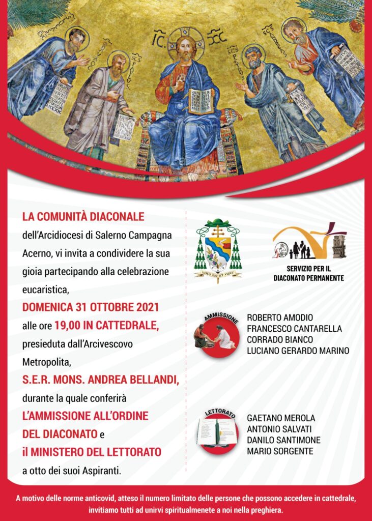 Domenica 31 ottobre alle ore 19.00 presso la cattedrale di Salerno si tiene la Celebrazione eucaristica in occasione del conferimento all’ammissione all’ordine del diaconato e al ministero del lettorato presieduta dal nostro Arcivescovo.