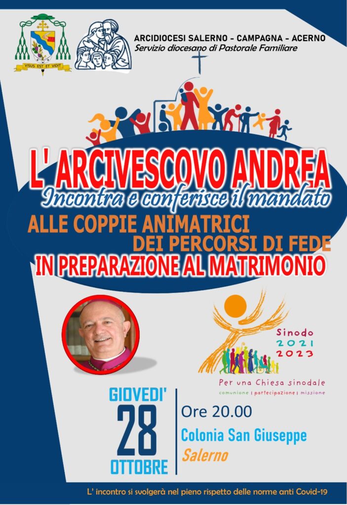 Giovedì 28 ottobre alle ore 20.00 presso la Colonia San Giuseppe in Salerno, il nostro Arcivescovo incontra e conferisce il mandato alle coppie animatrici dei percorsi di fede in preparazione al matrimonio. Di seguito la lettera di invito Lettera-invito ...