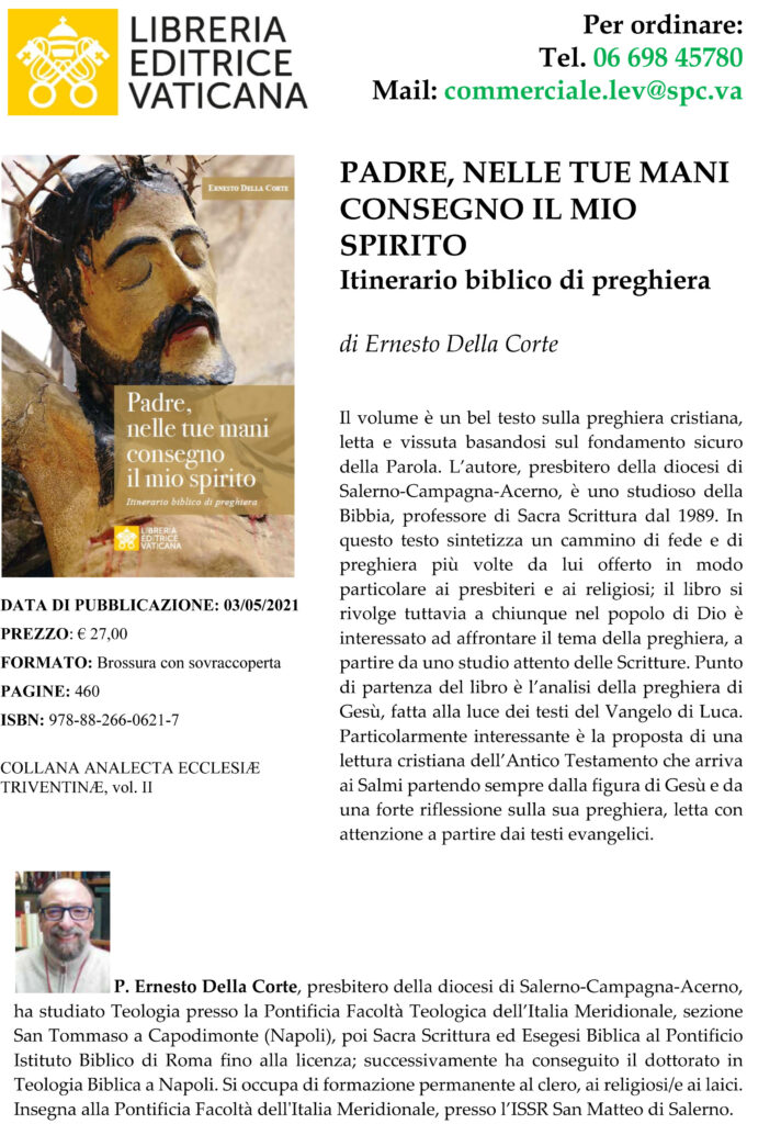 Don Ernesto Della Corte, presbitero dell’Arcidiocesi di Salerno-Campagna-Acerno, studioso della Bibbia, professore di Sacra Scrittura dal 1989 ha pubblicato un itinerario biblico di preghiera dal titolo “Padre, nelle tue consegno il mio spirito” un volume sulla preghiera cristiana, letta e vissuta basandosi sul fondamento ...