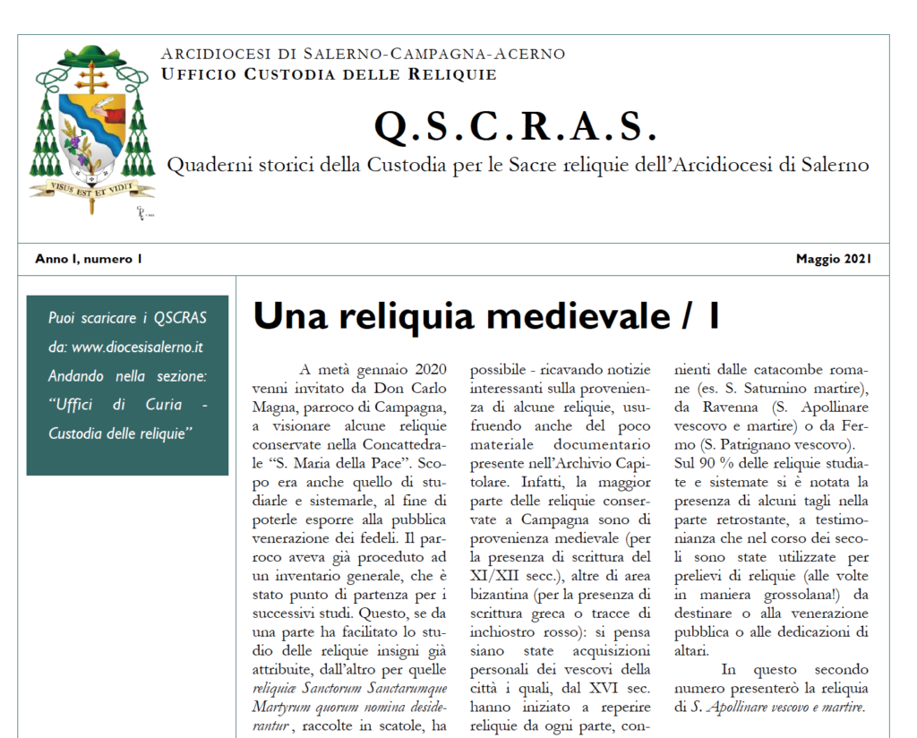 Don Sergio Capone, nel numero di maggio 2021, il secondo numero dei QSCRAS, presenta la reliquia medievale di S. Apollinare vescovo e martire. A metà gennaio 2020 venni invitato da Don Carlo Magna, parroco di Campagna, a visionare alcune reliquie ...