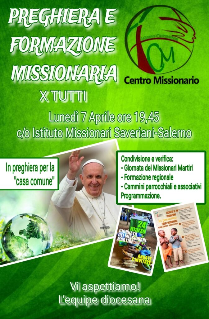 Lunedì 7 aprile alle ore 19.45 presso l’Istituto Missionari Saveriani a Salerno si terrà l’incontro di Preghiera e Formazione Missionaria. Questo appuntamento, organizzato dal Centro Missionario, è aperto a tutti e sarà un momento di condivisione e verifica su temi ...
