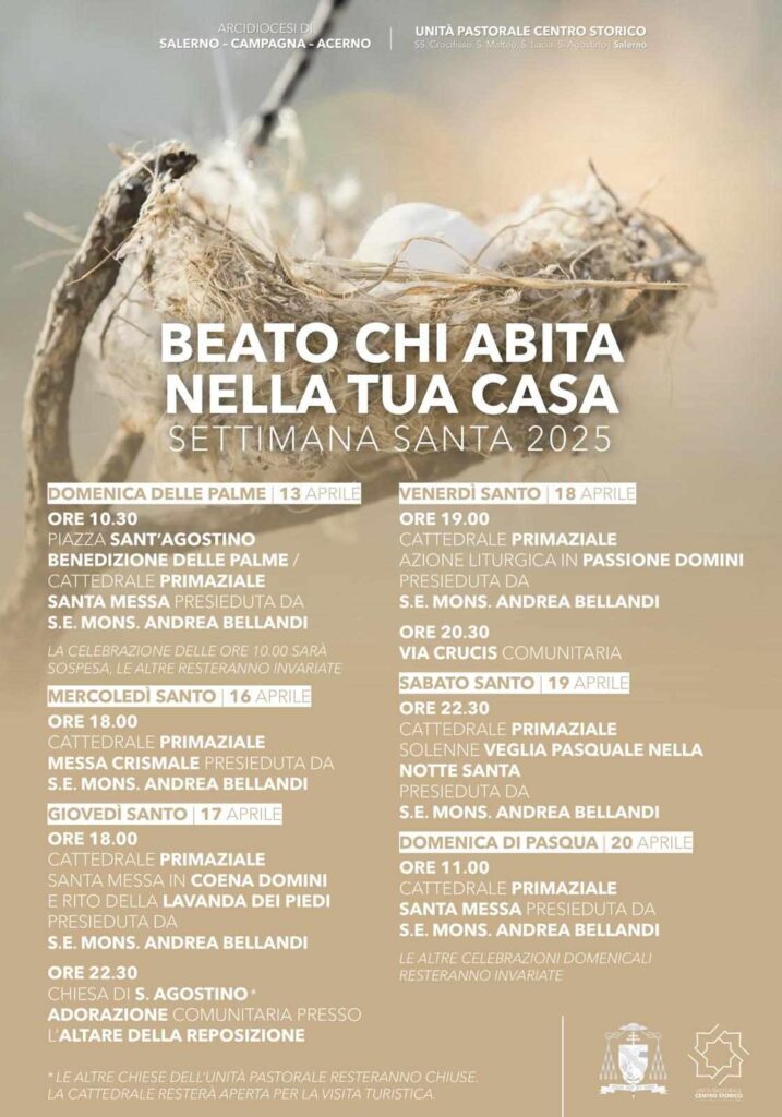 La Settimana Santa, oltre ai tradizionali appuntamenti, prevede, la Santa Messa all’ICATT di Eboli martedì 15 aprile alle ore 11 e la Messa in Coena Domini con la lavanda dei piedi, giovedì 17 aprile, alle 10, presso l’istituto penitenziario di Fuorni, a cura del Gruppo Scout ...