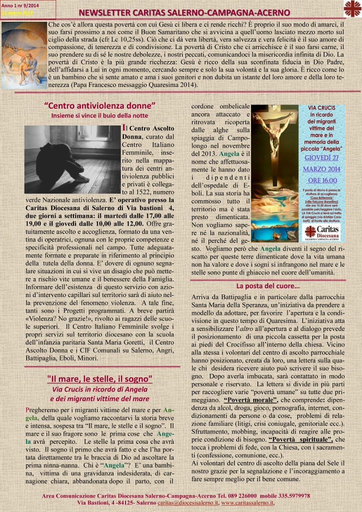Centro antiviolenza donne”. Insieme si vince il buio della notte. Il mare, le stelle, il sogno. Via Crucis in ricordo di Angela e dei migranti vittime del mare La posta del cuore Allegati: NEWS LETTER 9.pdf