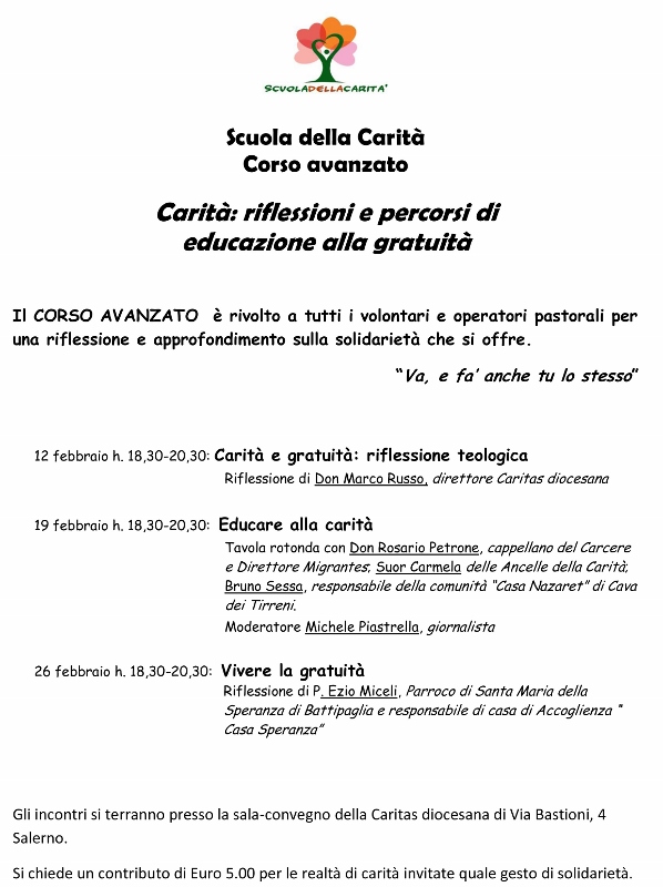 Scuola della Carità Corso avanzato Carità: riflessioni e percorsi di educazione alla gratuità. Il CORSO AVANZATO è rivolto a tutti i volontari e operatori pastorali per una riflessione e approfondimento sulla solidarietà che si offre. “Va, e fa’ anche tu ...
