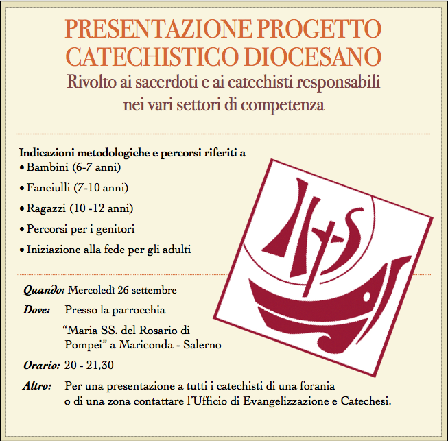 Mercoledì 26 settembre, alle ore 20,00 presso la parrocchia Maria SS. del Rosario di Pompei a Mariconda – Salerno si terrà la PRESENTAZIONE del PROGETTO CATECHISTICO DIOCESANO rivolto ai sacerdoti e ai responsabili dei catechisti parrocchiali nei vari settori di ...