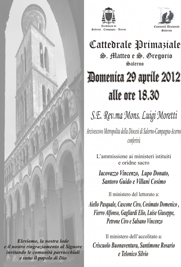 Domenica 29 aprile 2012 ore 18.30, Cattedrale di Salerno, durante la Celebrazione Eucaristica, S.E. Monsignor Luigi Moretti conferirà: l\’ammissione ai ministeri istituiti e al Diaconato permanente a quattro candidati; il Ministero del Lettorato ad otto candidati; il Ministero dell\’Accolitato a ...