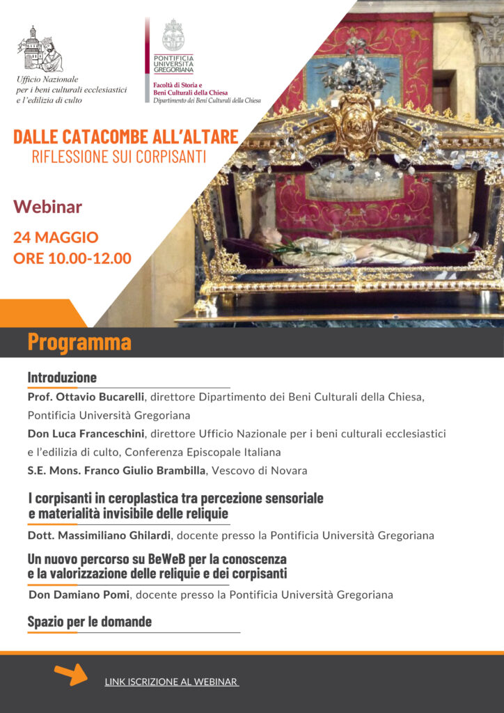 Venerdì 24 maggio dalle ore 10.00 alle ore 12.00 si svolgerà il webinar dal titolo “Dalle Catacombe all’altere | Riflessione suicorpisanti” su piattaforma Cisco Webex Meetings. I Corpi Santi sono reliquie particolari, sia per la loro origine, sia per la loro esposizione ...