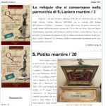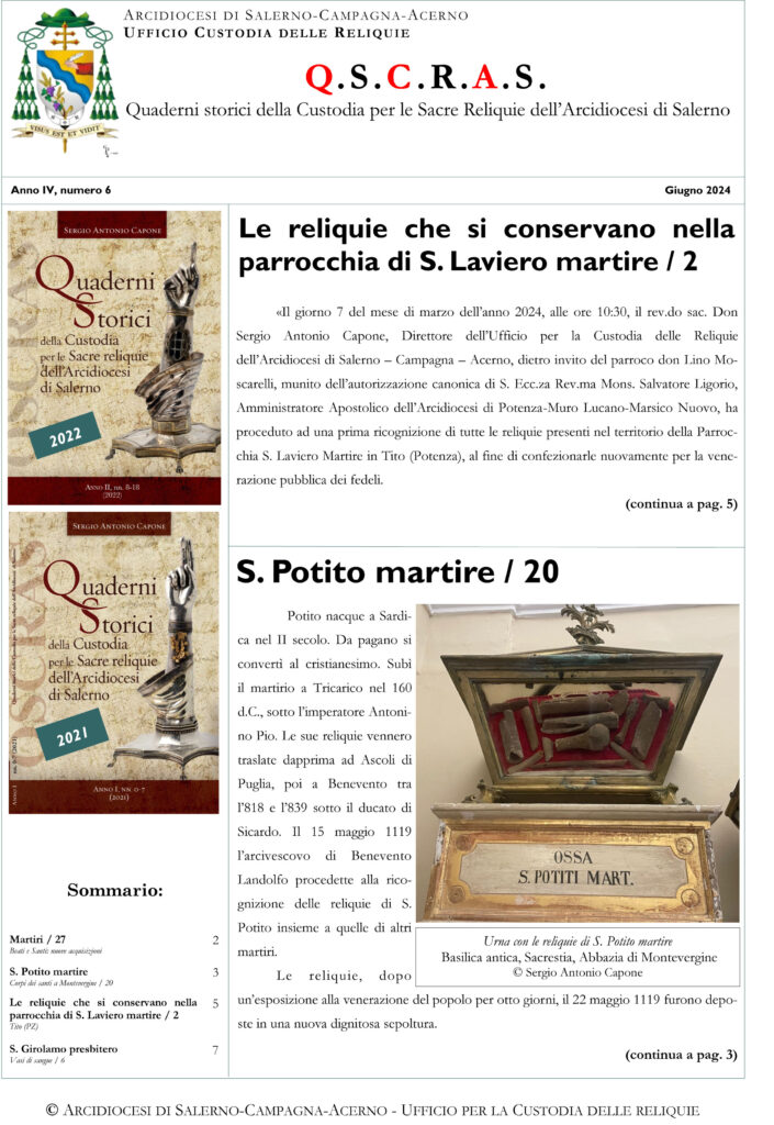 L’edizione QSCRAS numero 6, maggio 2024, apre con la ricognizione di tutte le reliquie presenti nel territorio della parrocchia S. Laviero Martire in Tito, Potenza. La prima pagina dedica un articolo anche a S. Potito martire che continua a pagina ...