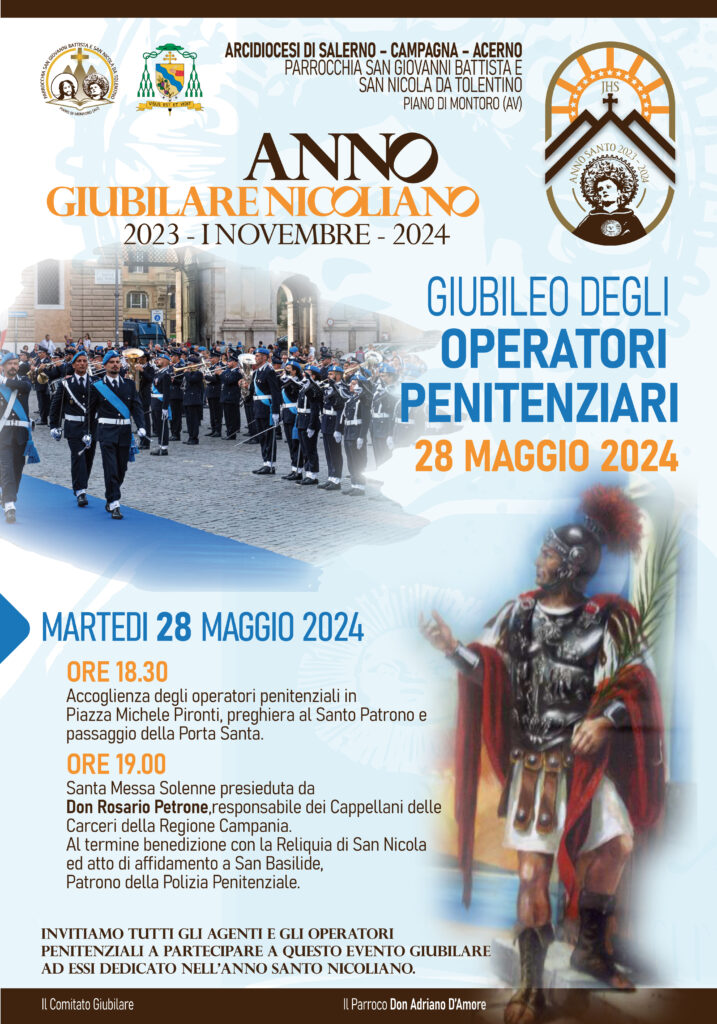 Martedì 28 maggio alle ore 18.30 presso la parrocchia di San Giovanni Battista e San Nicola da Tolentino, di Piano di Montoro, in occasione del Giubileo degli operatori penitenziari si terrà la Celebrazione Eucaristica presieduta da Don Rosario Petrone, responsabile dei ...