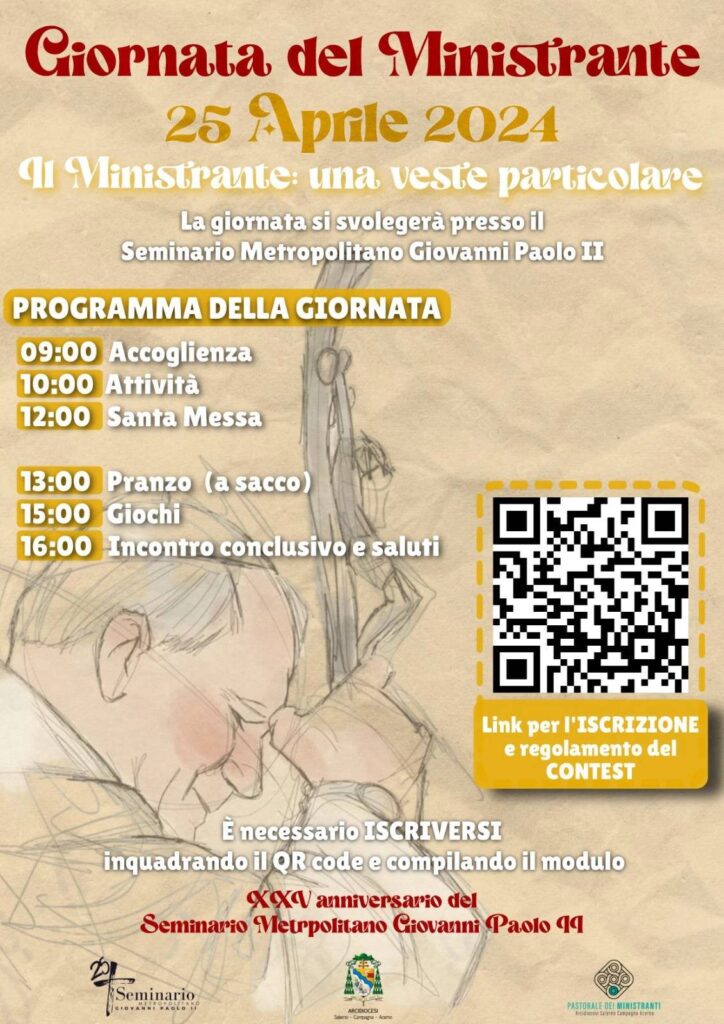 Giovedì 25 aprile, presso il Seminario Metropolitano Giovanni Paolo II, come da tradizione si terrà la Giornata del Ministrante, una giornata di gioia con giochi e preghiera con tutti i ministranti della nostra Arcidiocesi. Per partecipare basta iscriversi entro il ...