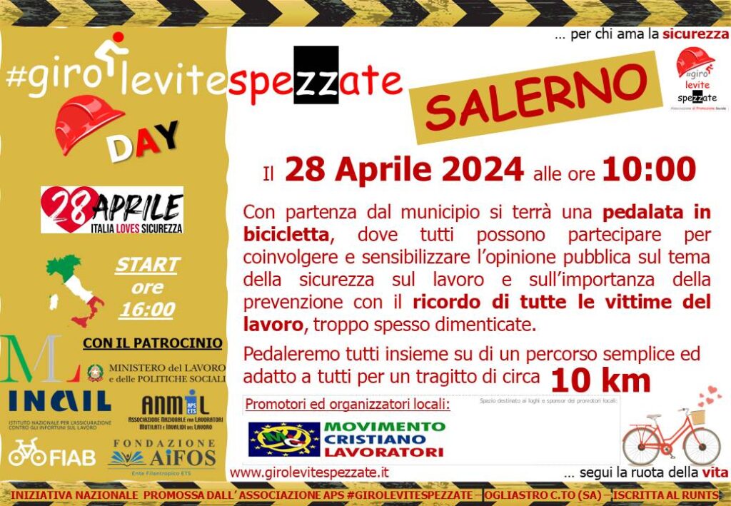 Domenica 28 aprile alle ore 10.00, dal Municipio di Salerno, partirà la pedalata per coinvolgere e sensibilizzare l’opinione pubblica sul tema della sicurezza sul lavoro. Un’iniziativa nazionale che coinvolge enti, istituzioni e associazioni, promossa dall’associazione “Giro le vite spezzate” in ...
