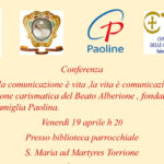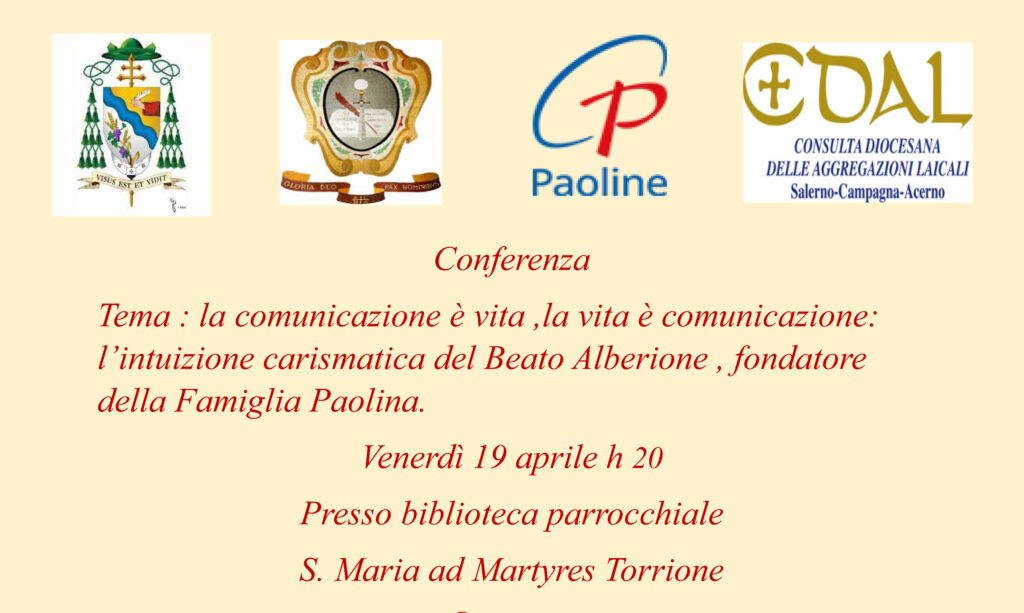 “La comunicazione è vita, la vita è comunicazione: l’intuizione carismatica del Beato Alberione, fondatore della Famiglia Paolina” La conferenza si terrà venerdì 19 aprile nella sala della biblioteca parrocchiale di S. Maria ad Martyres di Torrione. La comunicazione è la ...