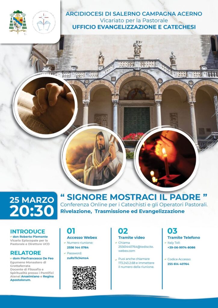 Lunedì 25 marzo alle ore 20.30 si terrà una conferenza online rivolta ai catechisti e agli operatori pastorali. Il titolo della conferenza è “Signore mostraci il Padre”, relaziona p. Pierfrancesco De Feo OSB, egumeno del monastero di Grottaferrata e docente ...