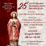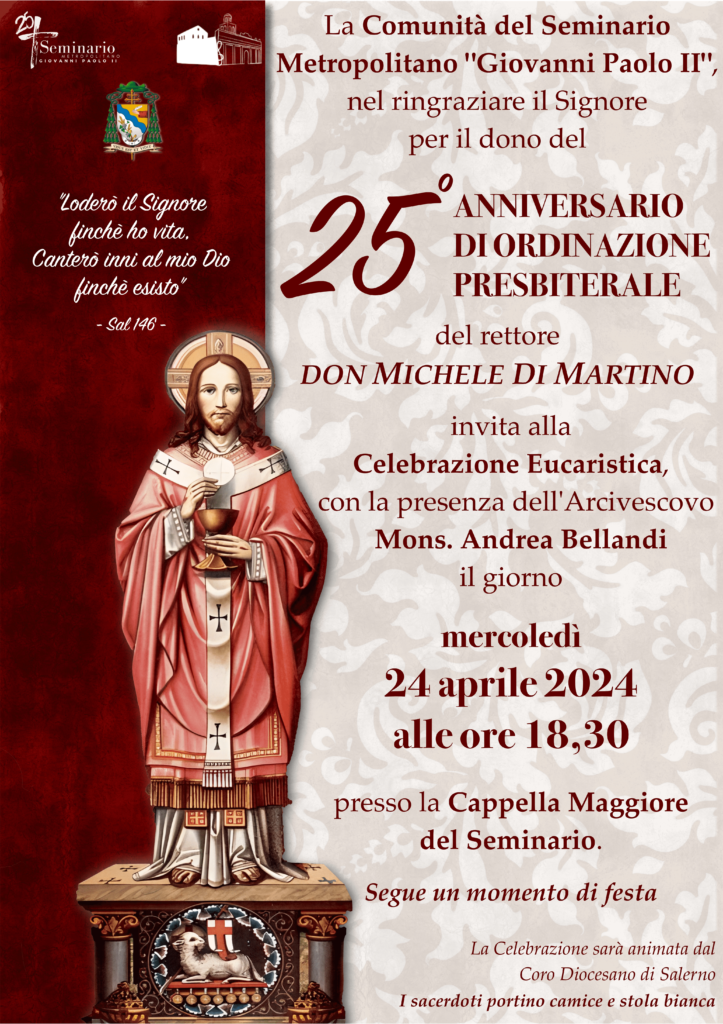 Mercoledì 24 aprile alle ore 18.30 presso la Cappella Maggiore del Seminario Metropolitano si terrà la Celebrazione Eucaristica con la presenza di S.E. Mons Andrea Bellandi in occasione del 25° anniversario di sacerdozio di don Michele Di Martino.