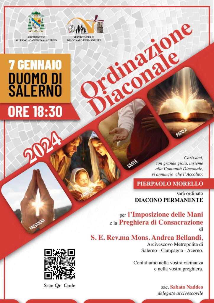 Domenica 7 gennaio alle ore 18.30 nel Duomo di Salerno Pierpaolo Morello sarà ordinato diacono permanente per l’imposizione delle mani e la Preghiera di consacrazione di S.E. Mons. Andrea Bellandi. La liturgia sarà animata dal gruppo del Rinnovamento nello Spirito.