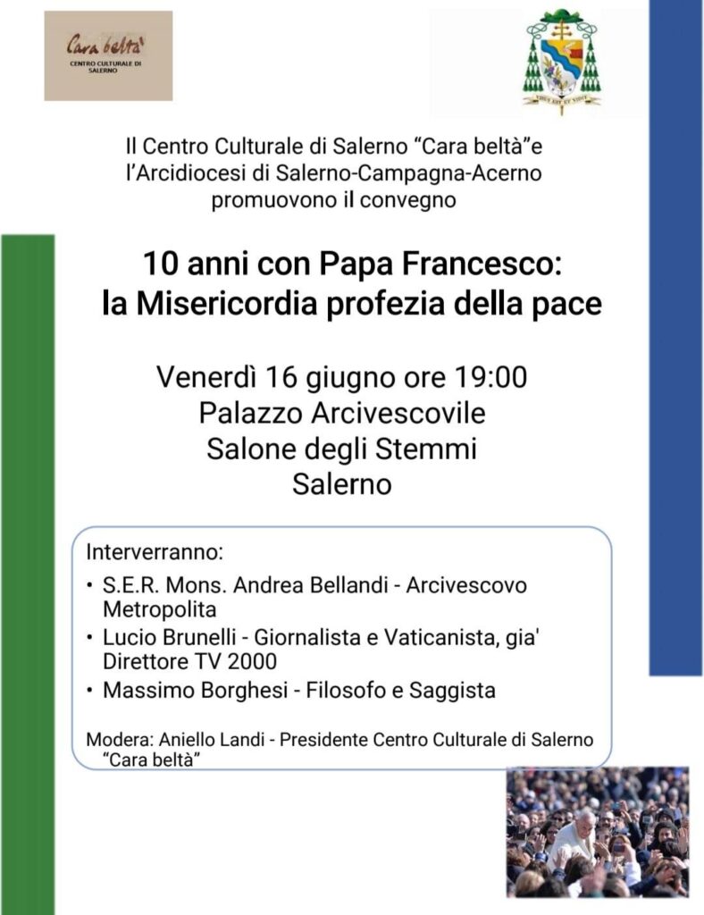 “10 anni con Papa Francesco: la Misericordia profezia della pace”: è questo il titolo dell’incontro promosso dal Centro culturale di Salerno Cara beltà, in collaborazione con l’Arcidiocesi di Salerno – Campagna- Acerno e in programma venerdì 16 giugno 2023, alle ...
