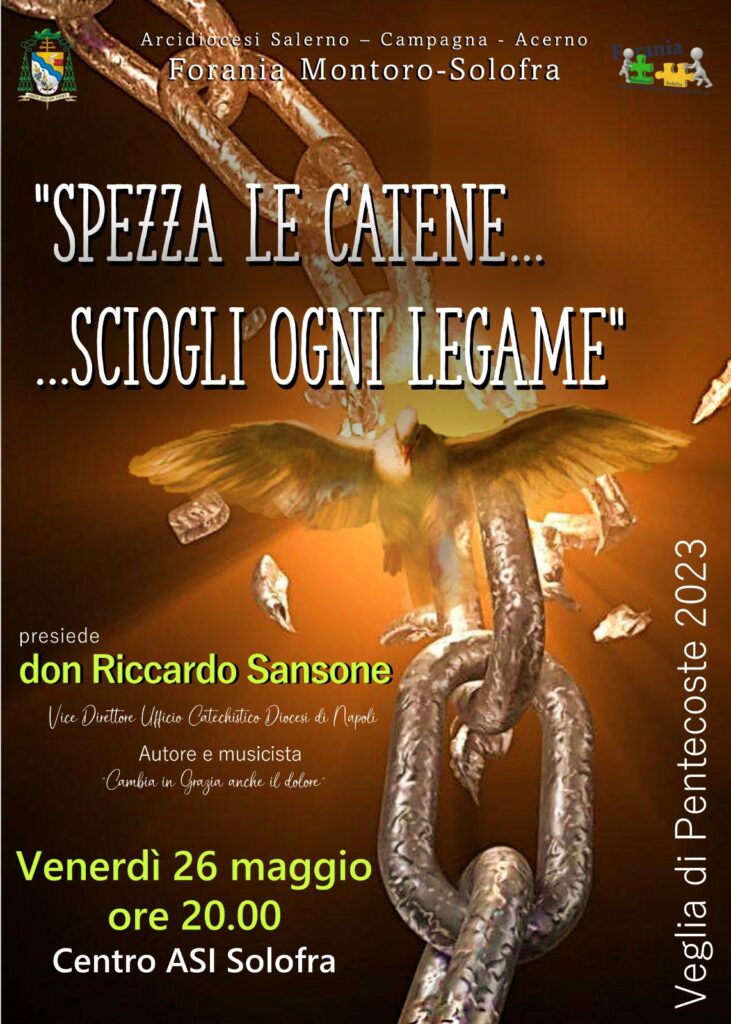 Venerdì 26 maggio, alle ore 20.00, presso il Centro Asi di Solofra si tiene la veglia di Pentecoste dal titolo “Spezza le catene… sciogli ogni legame”. Un momento di preghiera e riflessione sullo Spirito Santo guidato da don Riccardo Sansone, ...