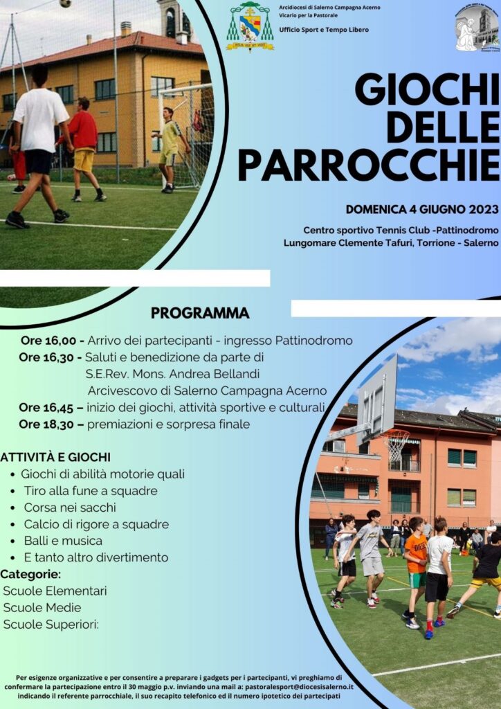 Su invito del Coni di Salerno l’ufficio Sport e Tempo Libero intende promuovere “I Giochi delle Parrocchie” attività riservate alle parrocchie della nostra Arcidiocesi. A Salerno la manifestazione si svolgerà domenica 4 giugno presso il Centro sportivo Tennis Club/Pattinodromo Lungomare ...