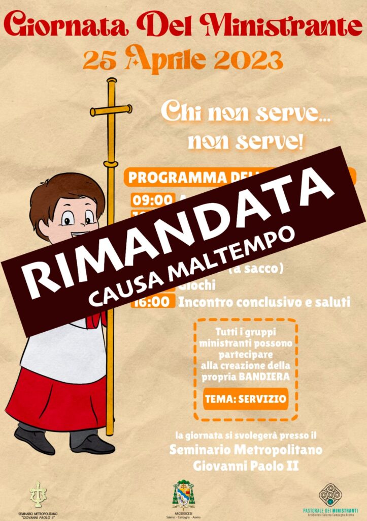 APPUNTAMENTO RIMANDATO Martedì 25 aprile, dalle ore 9.00, presso il Seminario Metropolitano “Giovanni Paolo II” di Pontecagnano Faiano, si tiene la Giornata del Ministrante. Il tema della giornata prende spunto da ciò a cui un ministrante dovrebbe ...
