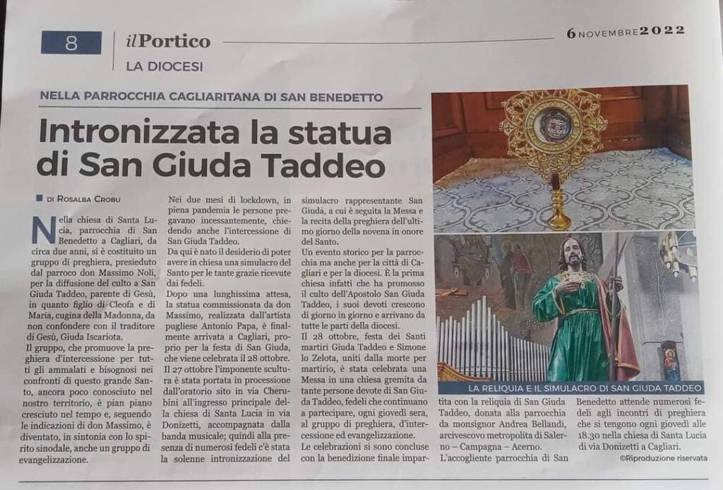 Lo scorso 27 ottobre alla presenza di numerosi fedeli si sono tenute le celebrazione per accogliere le reliquie di San Giuda Taddeo donate dalla nostra Arcidiocesi alla parrocchia di San Benedetto di Cagliari.